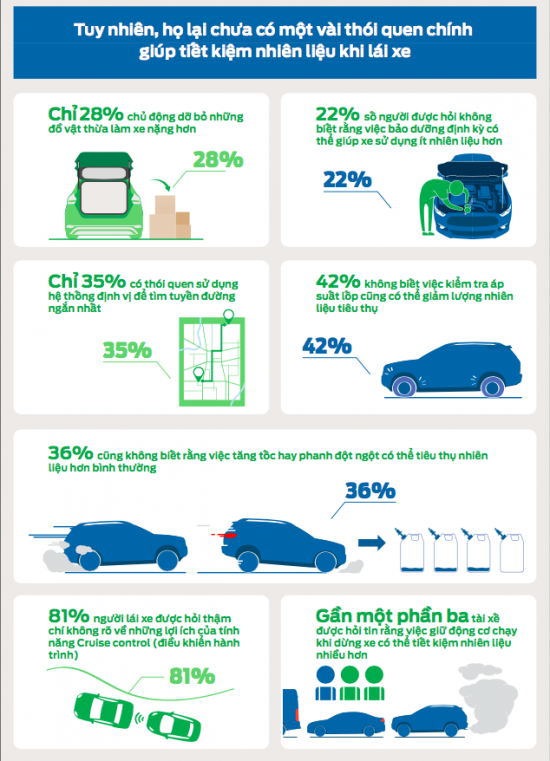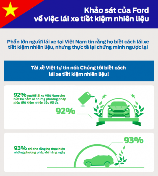 Mặc dù người dùng Việt Nam đã bắt đầu chú ý hơn tới việc mua những chiếc xe tiêu thụ ít nhiên liệu để tiết kiệm tiền cho họ, cách tốt nhất để làm điều này vẫn là xây dựng thói quen lái xe đúng cách (và điều này hoàn toàn miễn phí!). Khảo sát về lái xe tiết kiệm nhiên liệu được Công ty Ford Motor thực hiện trên 9,500 người sử dụng xe trên 11 thị trường tại khu vực Châu Á – Thái Bình Dương, trong đó có 774 người tham gia đến từ Việt Nam.