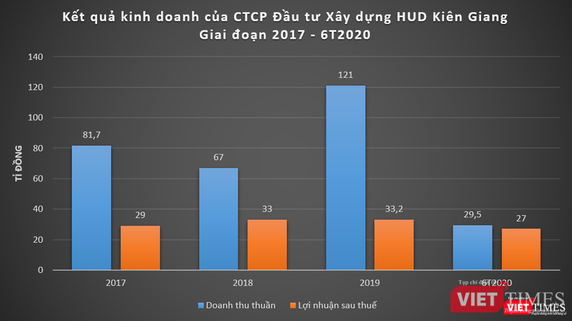 Về kết quả kinh doanh, 6 tháng đầu năm 2020, HUD Kiên Giang (công ty mẹ) ghi nhận doanh thu thuần đạt 29,5 tỉ đồng, tăng 13% so với cùng kỳ năm ngoái; lợi nhuận sau thuế ở mức 27 tỉ đồng, giảm 19%.