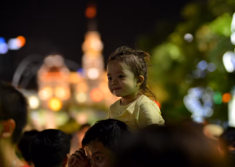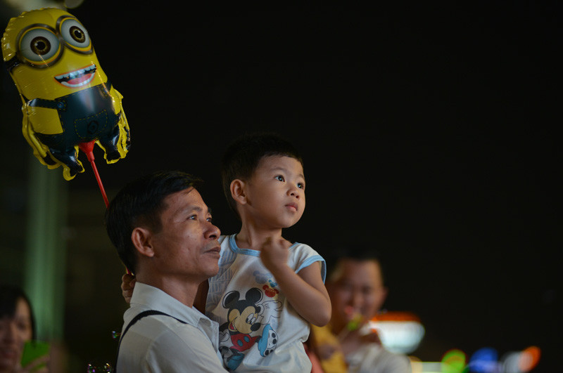 Các ông bố, bà mẹ dắt con đi chơi ngày khai mạc đường hoa Nguyễn Huệ