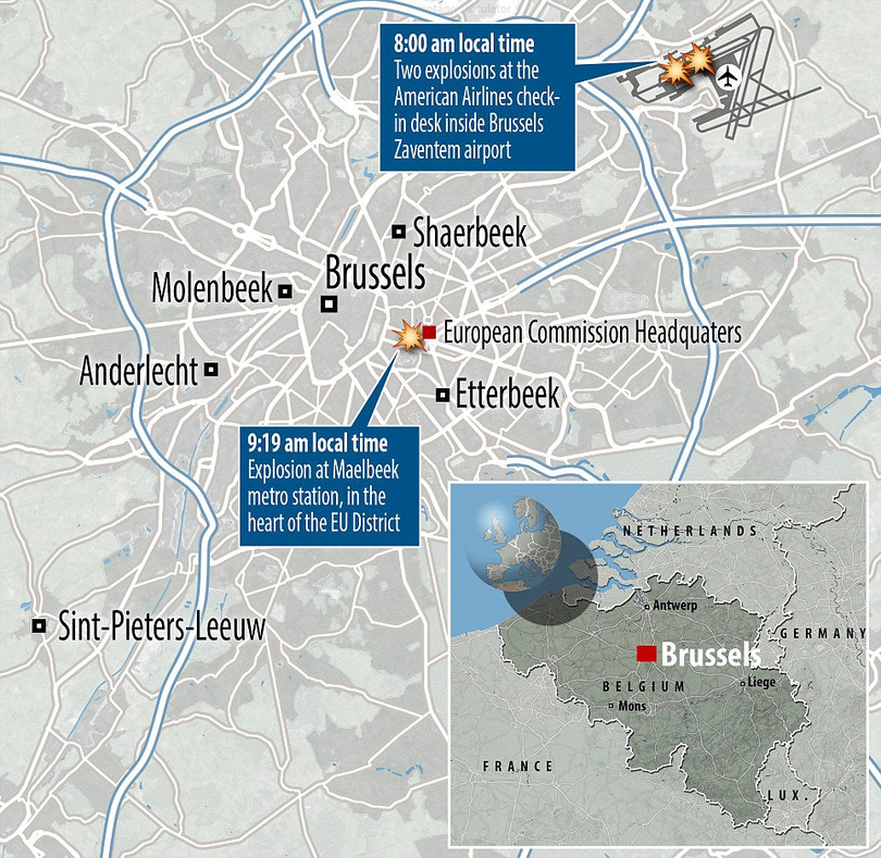 Sơ đồ diễn ra các vụ tấn công khủng bố dây chuyền tại Brussel, Bỉ