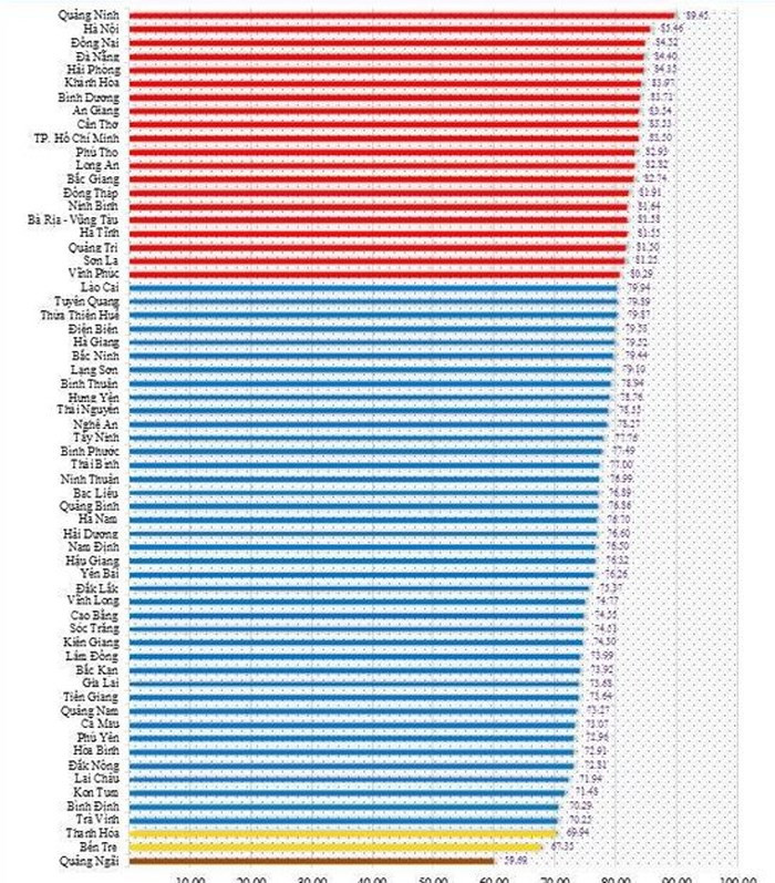 Báo cáo của Bộ Nội vụ nêu rõ, kết quả xếp hạng Chỉ số CCHC năm 2017 của các tỉnh, thành phố đã có những thay đổi đáng kể so với năm 2016, cho thấy sự quan tâm của lãnh đạo UBND các tỉnh, thành phố dành cho công tác cải cách hành chính ngày càng nhiều. Trong năm 2017, tỉnh Quảng Ninh đã xuất sắc vượt lên vị trí dẫn đầu bảng xếp hạng Chỉ số CCHC năm 2017 của các địa phương, với kết quả điểm đạt được là 89,45/100, cao hơn so với đơn vị đứng ở vị trí thứ 2 là Hà Nội tới 3,99 điểm.