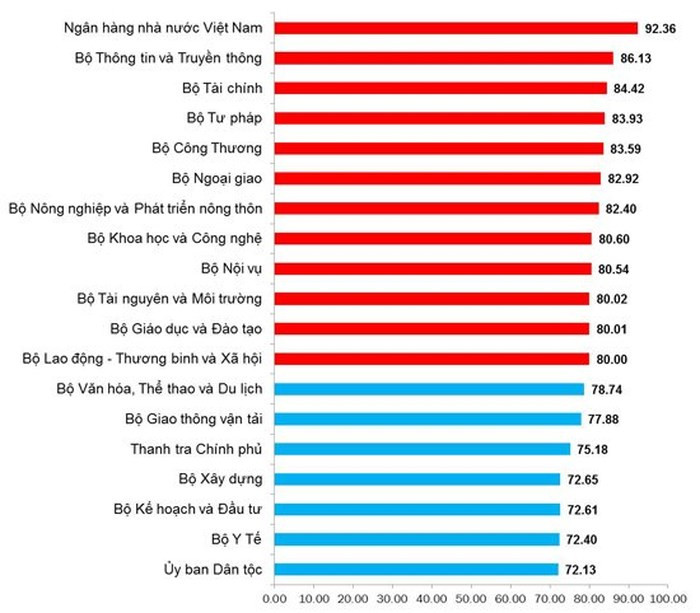 Kết quả Chỉ số CCHC năm 2017 của các Bộ, ngành tập trung vào 2 nhóm. Trong đó, nhóm 1 gồm 12 Bộ, cơ quan ngang Bộ đạt kết quả Chỉ số CCHC trên 80%, gồm có: Ngân hàng Nhà nước Việt Nam; Bộ TT&TT; Bộ Tài chính; Bộ Tư pháp; Bộ Công Thương; Bộ Ngoại giao; Bộ NN&PTNT; Bộ KH&CN; Bộ Nội vụ; Bộ TN&MT; Bộ GD&ĐT; Bộ LĐTB&XH. Nhóm thứ hai là 7 Bộ, cơ quan ngang Bộ đạt kết quả Chỉ số CCHC năm 2017 từ trên 70% đến dưới 80%, gồm có: Bộ VHTT&DL; Bộ Giao thông Vận tải; Thanh tra Chính phủ; Bộ Xây dựng; Bộ KH&ĐT; Bộ Y Tế và Ủy ban Dân tộc.