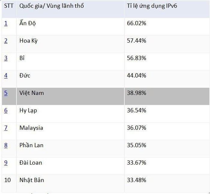 Chỉ riêng trong 6 tháng đầu năm 2019, tỉ lệ ứng dụng IPv6 tại Việt Nam đã tăng đến 15% với hơn 16 triệu người sử dụng IPv6. Trong khi đó, tỉ lệ ứng dụng IPv6 chung toàn cầu hiện mới đạt 22,98%. Với kết quả này, Việt Nam hiện xếp thứ nhất Đông Nam Á, thứ 2 Châu Á và thứ 5 trên thế giới về tỉ lệ ứng dụng IPv6 (sau Ấn Độ, Hoa Kỳ, Bỉ, Đức).