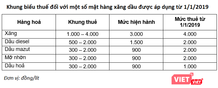 Biểu thuế mới sẽ có hiệu lực kể từ ngày 1/1/2019. Mốc thời gian này được đưa ra nhằm đảm bảo không có sự tác động tăng giá các mặt hàng xăng dầu tới chỉ số giá tiêu dùng (CPI) và ảnh hưởng tới mục tiêu kiềm chế lạm phát dưới 4% năm 2018 đã được Quốc hội quyết định.