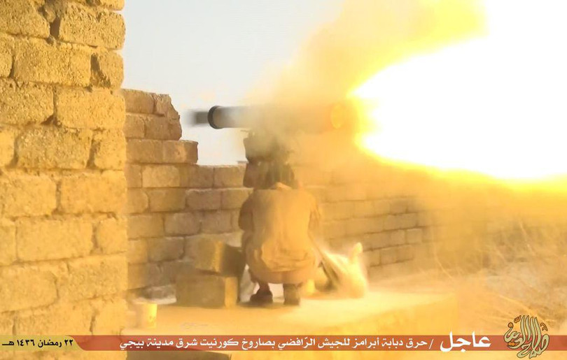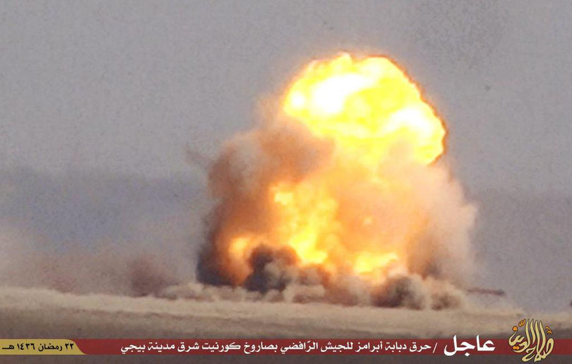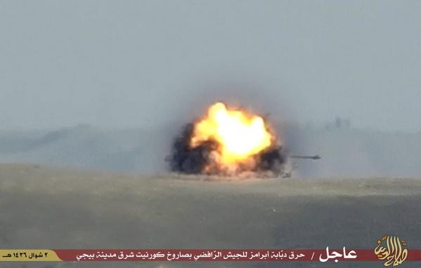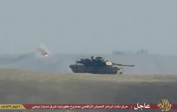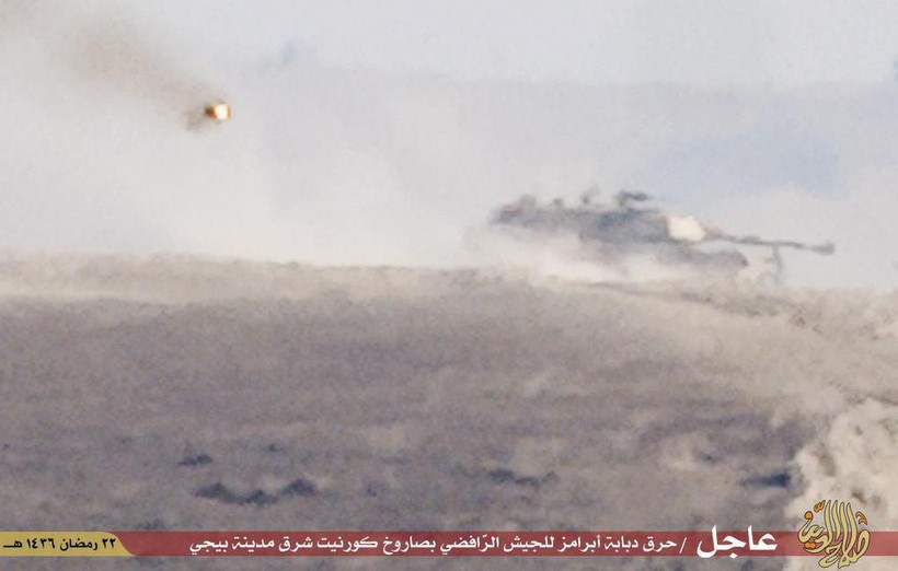 Nhóm khủng bố Nhà nước Hồi giáo tại Iraq vừa tung ra đoạn video cho thấy các chiến binh cực đoan đã sử dụng tên lửa chống tăng Nga ATGM 9K129 "Kornet-E" tấn công xe tăng M1A1M Abrams của quân đội Iraq vào ngày 09.07,2015 gần Baiji (200 km về phía bắc Baghdad). Rockets "Kornet-E" trong cả hai trường hợp đều đánh trúng xe tăng và theo tổ chức cực đoan Hồi giáo IS này thì xe đã bị phá hủy. Theo một trong những tài khoản "twitter"- của các chiến binh ISIS thì đây là chiếc xe tăng Abrams thứ chín và thứ mười của quân đội Iraq bị phá hủy bởi "chiến binh thánh chiến" trong các trận đánh gần Baiji.