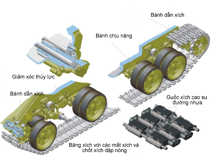 Т-90/ Т-90А Giáp phản ứng nổ gắn trên xe Contact-5 ( được chế tạo bởi tậpđoàn Thép NII Steel, năm 1986, Thành phố Moscow). Hộp giáp Contact-5 sử dụng những thànhphần phản ứng nổ 4S22 (trên các xe tăng thế hệ 1) hoặc 4S23 (trên các xethế hệ tiếp theo như T-90A) Giáp phản ứng nổ trên tấm giáp đầu xe là 12khối giáp, trên tháp pháo phía trước và trên mặt là 8 khối giáp phảnứng nổ, trên các tấm chắn sườn xe là 6 tấm chắn. Thông số kỹ thuật của thành phần phản ứng nổ 4S22 Các thành phần của giáp phản ứng nổ có khả năng làm việc trong trườnghợp bị va đập với gia tốc lến đến 196 m/s2 trong trường hợp rơi từ độcao 1,5m trên bê tông và thép, hoạt động trong dải nhiệt độ từ - 50 o Cđến + 50 o C. Thuốc nổ của thành phần 4C22 không hoạt động ngay cả khibị xạ kích bởi đạn xuyên cháy 7,62mm và 12,7 mm, mảnh đạn của đạn pháokhi đạn pháo nổ ở khoảng cách 10m, khi bị đốt cháy bởi các vật liệu gâycháy và napal. Các miếng giáp phản ứng nổ 4C22 được đặt trong các khoangriêng được thiết kế trong xe. Lắp đặt giáp phản ứng nổ trên xe T-90 Khối lượng của giáp phản ứng nổ Т-90 - 1500 kg Số lượng các khối giáp phản ứng nổ trên các bộ phận của xe tăng. Trên tháp pháo – 8 khối; Diện tích che phủ của phần đầu xe tăng: Khả năng tăng cường bảo vệ của giáp phản ứng nổ: Theo các thông báo không chính thức xe tăng Т-90А / Т-90SАđã đượclắp loại giáp phản ứng nổ thế hệ thứ 3 "Kactus”” Relict” với các thànhphần 4S23. Hệ thống giáp phản ứng nổ thế hệ thứ 2 Kontact – 5 trên đầu xe và giáp phản ứng nổ hiện đại hơn trên tháp pháo của xe tăng T-90 Т-90М- Xe tăng T-90M được lắp đặt hệ thống giáp phản ứng nổ "Relict” đượcthiết kế bởi tổ hợp NII Stali OKR "Kactus” và "Relict” với các mảnh giápnổ loại 4S23 Đểgiảm sự tác động của sóng điện từ và sóng phóng xạ khoang điều khiển vàkhoang chiến đấu được lắp đặt các tấm polimer chắn phóng xạ với cácthành phần Lithium, Boron và Lead. Trên xe tăng nâng cấp T-90M " dự án188M” tấm chắn vách ngăn được thay thế bằng vật liệu chịu lửa và chịumảnh Kevlar. Hệ thống chuyển động và truyền động lực Hệ thống chuyển động kiểugiá treo. Trục xoắn độc lập, có sáu bánh chịu nặng mỗi bên sườn xe,trên đôi bánh chịu nặng số 1, số 2 và số 6 có lắp đặt hệ thống giảm xócbằng cánh thủy lực. đường kính của bánh chịu nặng là 750mm được bọc caosu tổng hợp chịu mài mòn, khung xương bánh xe được chế tạo bằng vật liệunhôm tổng hợp. Chiều rộng của bánh xe rộng hơn 10 mm so với bánh chịunặng của T-72B.
