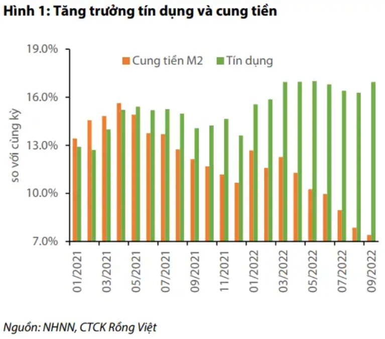 Xét về xu hướng, tăng trưởng huy động vốn từ doanh nghiệp liên tục suy giảm từ đầu năm đến nay, huy động vốn từ dân cư cải thiện trong nửa đầu năm nhưng không thay đổi nhiều trong quý 3. Tốc độ tăng cung tiền liên tục suy giảm, chỉ tăng 3,2% so với đầu năm và tăng 7,4% so với cùng kỳ, chưa bằng một nửa tốc độ tăng trưởng bình quân cung tiền của giai đoạn 2013 – 2021.
