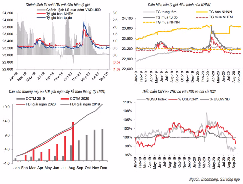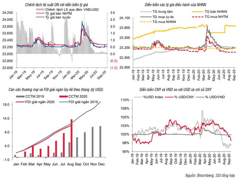 Theo số liệu mới nhất của Tổng cục Hải Quan, cán cân thương mại tháng 8/2020 thặng dư tới 5 tỷ USD, giúp cho xuất siêu lũy kế 8 tháng cao kỷ lục, đạt 13,5 tỷ USD – gấp 2,5 lần so với cùng kỳ 2019. Số liệu từ Ngân hàng Nhà nước cũng cho thấy cán cân tổng thể thặng dư tăng 5,1 tỷ USD trong nửa đầu năm 2020. Theo SSI, nguồn cung ngoại tệ trong nước hiện đang rất thuận lợi, tỷ giá USDVND sẽ vẫn ổn định ở mức hiện tại./.