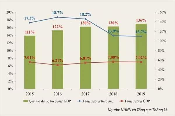 Cụ thể, tăng trưởng tín dụng năm 2019 đạt 13,7%, theo đó dư nợ tín dụng toàn ngành tính đến cuối năm 2019 xấp xỉ 8,2 triệu tỉ đồng, gấp 2,1 lần so với cách đây năm năm, trong khi đó GDP nếu tính theo giá hiện hành năm 2019 là 6.037.348 tỉ đồng, chỉ tăng 1,4 lần so với năm 2015.