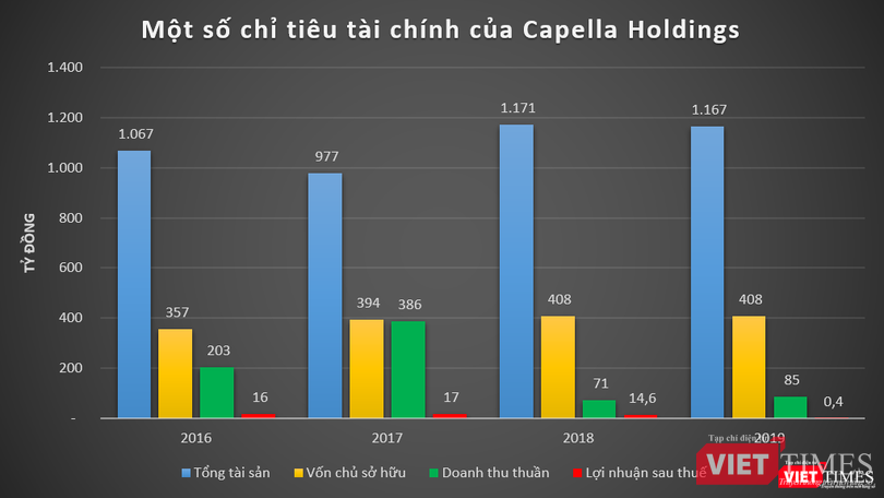 Mức lợi nhuận kể trên có thể nói là không đáng kể nếu so với quy mô tài sản, nguồn vốn của Capella Holdings. Tính đến cuối năm 2019, tổng tài sản của Capella Holdings đạt 1.166 tỷ đồng, giảm khoảng 4 tỷ đồng so với năm trước; vốn chủ sở hữu tăng nhẹ lên 408 tỷ đồng.