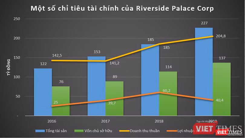 Sang năm 2019, doanh thu thuần của Riverside Palace Corp đạt 204 tỷ đồng, tăng 10% so với năm 2018; nhưng lợi nhuận sau thuế lại giảm 33% về mức 40,4 tỷ đồng.