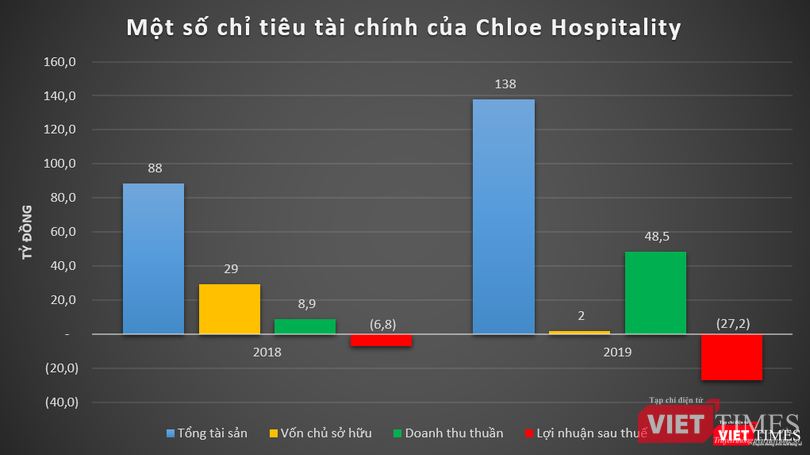 Cụ thể, năm 2019, doanh thu thuần của Chloe Hospitality đạt 48 tỷ đồng, tăng hơn 5 lần so với năm 2018; tuy nhiên, doanh nghiệp này báo lỗ sau thuế ở mức 27,2 tỷ đồng, trong khi năm 2018 lỗ 6,8 tỷ đồng.
