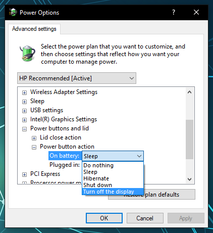 Trong hộp thoại Power Options vừa xuất hiện, lựa tìm phần Power buttons and lid -> Power button action. Nếu dùng laptop hoặc tablet sẽ có 2 phần On battery và Plugged in, chọn trường hợp mà bạn muốn chỉnh, nhấp vào mũi tên xổ xuống ở ô chọn kế bên -> chọn Turn off the display. Cuối cùng, nhấn OK để lưu lại thiết lập và hoàn tất.