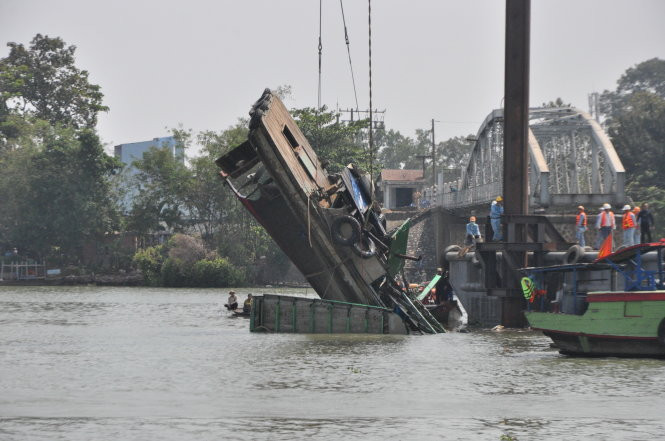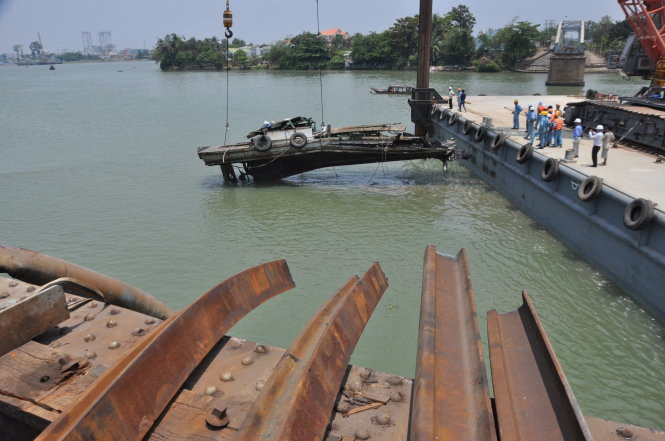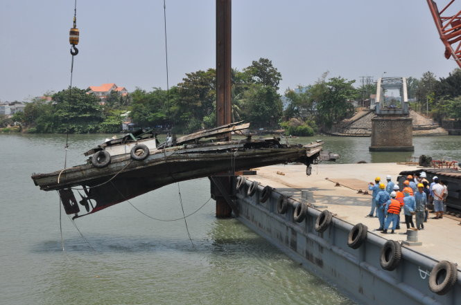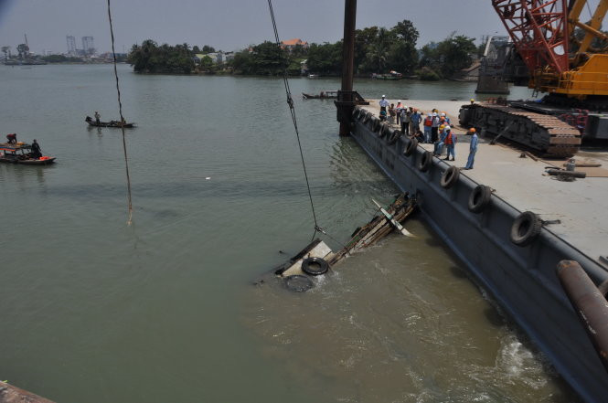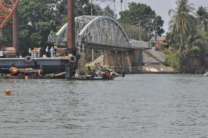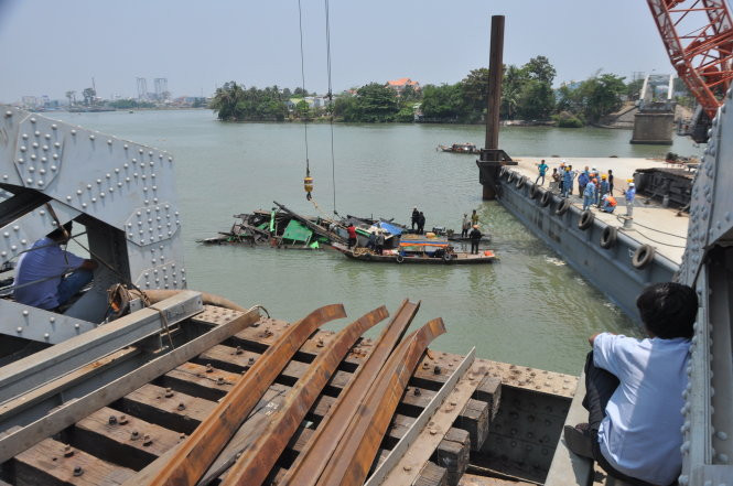 Vị trí trục vớt chiếc tàu đẩy nằm ngay chỗ nhịp dầm số 3 cầu Ghềnh được cẩu lên một ngày trước đó, cách mố cầu số 3 khoảng 20m.