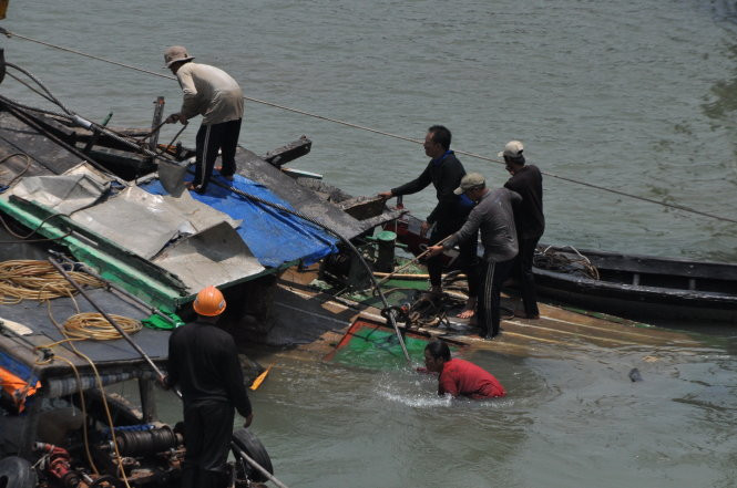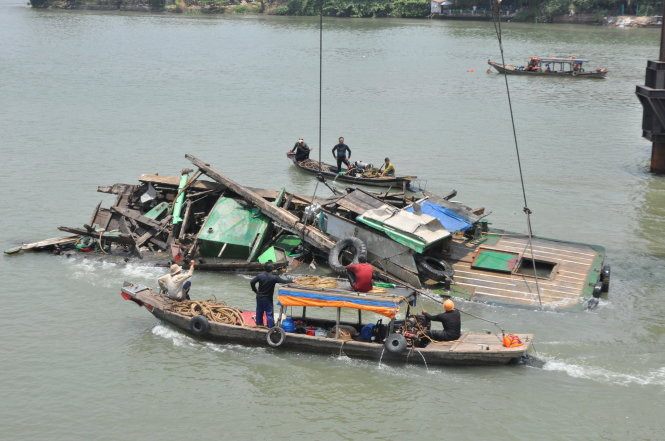 Do vỏ tàu đẩy rệu rã nên đơn vị trục vớt phải cố định dây cáp, nâng lên đưa xuống đến bốn lần mới vớt được sà lan lên.