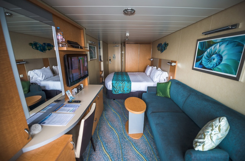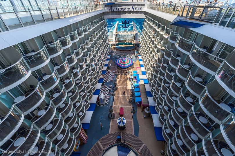 Tàu du lịch là hai khách sạn song song với nhau, kết nối bằng những kết cấu, ở giữa là không gian xanh. Phía trên là khu vực bể bơi, ghế nằm phơi nắng.