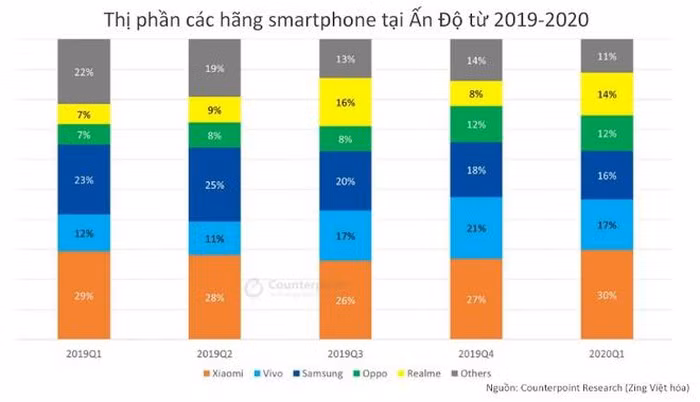 Tuy nhiên, trên thực tế, thị trường smartphone Ấn Độ từ lâu đã trở thành “sân chơi” riêng cho các ông lớn Trung Quốc, đơn cử như Xiaomi, Realme, Oppo và Vivo.
