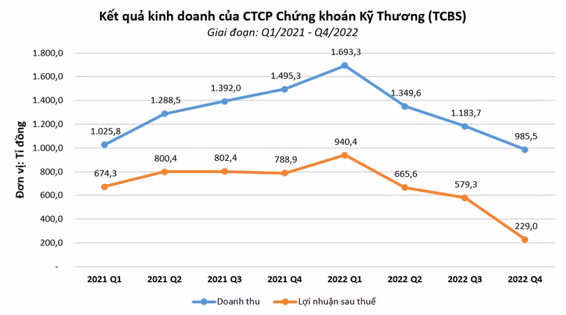 CTCP Chứng khoán Kỹ Thương (TCBS) vừa công bố kết quả kinh doanh quý 4/2022 với doanh thu và lợi nhuận sau thuế đạt lần lượt 985,4 tỉ đồng và 229 tỉ đồng, giảm 34% và 71% so với cùng kỳ năm 2021.