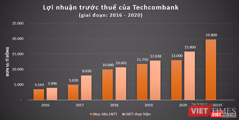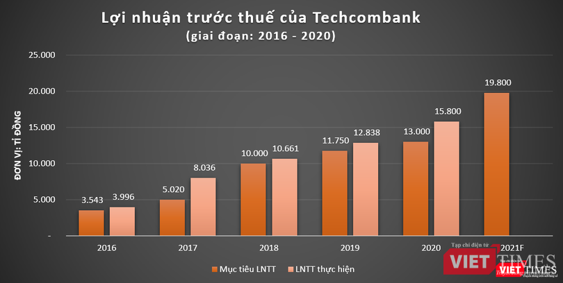 Kết quả kinh doanh của TCB cũng có sự tăng trưởng khá tương đồng với tăng trưởng tín dụng khi nhà băng này báo lãi trước thuế hợp nhất năm 2020 ở mức 15.800 tỉ đồng, vượt 22% so với kế hoạch năm. Dù rằng, trong năm 2020, TCB đã tái cơ cấu và điều chỉnh lịch trả nợ cho hơn 3.200 khách hàng với số dư nợ lên tới 41.000 tỉ đồng theo Thông tư 01 của NHNN.