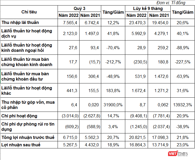 Lũy kế 9 tháng đầu năm 2022, nhà băng này báo lãi trước thuế 20.821,5 tỉ đồng, qua đó hoàn thành 77% kế hoạch lợi nhuận đề ra. Trừ đi chi phí thuế thu nhập doanh nghiệp, Techcombank báo lãi ròng 16.864,3 tỉ đồng, tăng trưởng 23% so với cùng kỳ năm 2021.
