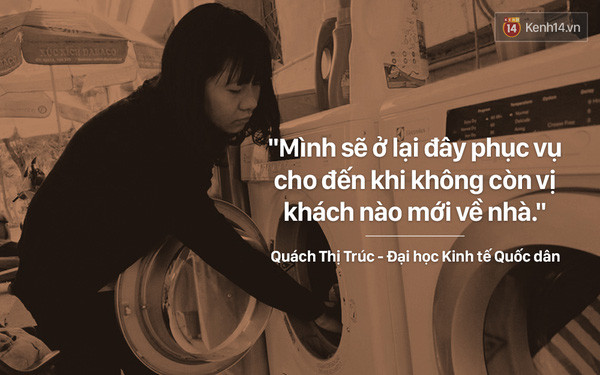 Cùng chung suy nghĩ hướng đến người khác, Quách Thị Trúc (23 tuổi, sinh viên năm cuối Khoa khoa học quản lý, Trường Đại học kinh tế quốc dân, Hà Nội) cho biết, dịp Tết năm nay, cô sẽ nán lại đến khi nào hết khách thì thôi. Công việc làm thêm của Trúc là giặt quần áo thuê ngay trong khuôn viên ký túc xá nhà trường.