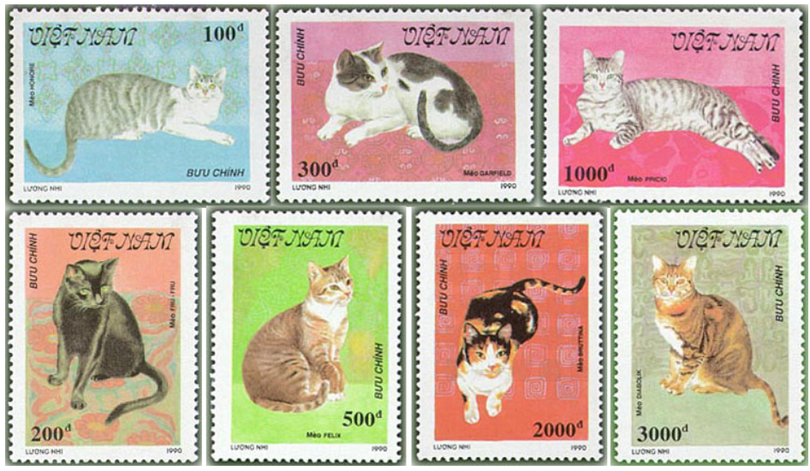 Mèo nhà cũng có 3 bộ khá đa dạng và phong phú về chủng loại. Năm 1986, Bưu chính Việt Nam phát hành bộ mã số 493 có 7 mẫu, chủ yếu giới thiệu đầu và mặt các loại mèo phổ biến, hình vẽ đẹp, mềm mại, nêu được nét đặc sắc của mỗi loài, đặc biệt có một con mèo mắt đỏ khá hiếm. 2 bộ còn lại vẽ toàn thân mèo.