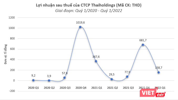 Trong khi đó, theo báo cáo tài chính riêng quý 1/2022, lợi nhuận sau thuế của THD là 80 tỉ đồng, tăng 279% so với cùng kỳ năm 2021. Nguyên nhân chủ yếu, theo THD, là do công ty thực hiện chuyển nhượng vốn góp các khoản đầu tư và hoàn nhập dự phòng các khoản đầu tư vào đơn vị khác.