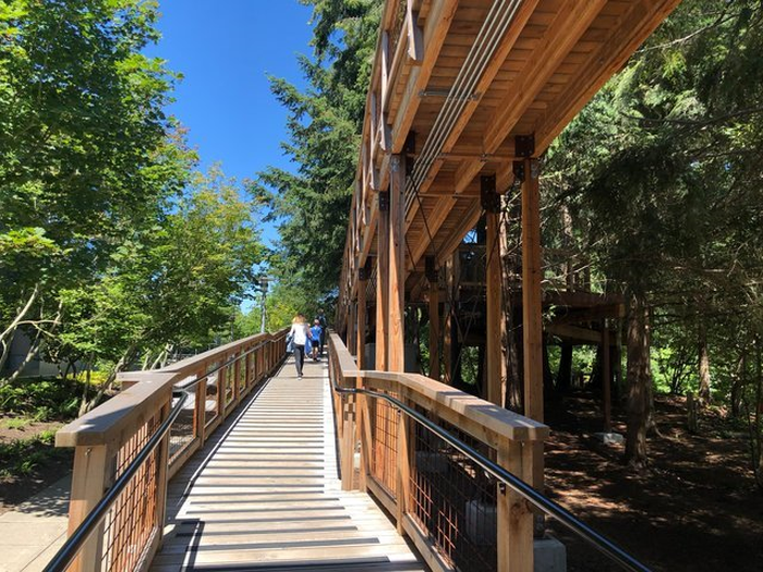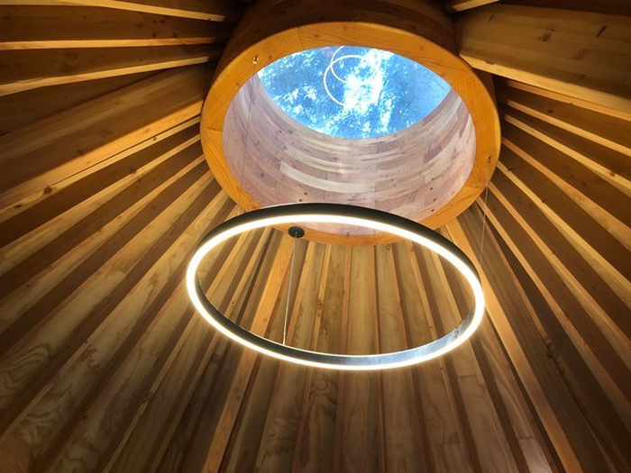 Mái nhà là dạng mái vòm hình nón được chống đỡ bởi nhiều thanh xà bằng gỗ. Điểm đáng chú ý nhất là phần khoét mái nhà hình tròn, cho phép người ở trong có thể nhìn lên tận các vòm lá cao nhất. Từ trên này có thể thấy lấp ló một vài quán cà phê. Tuy nhiên chủ yếu khu vực vẫn rất riêng tư với nhiều cây.