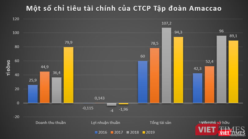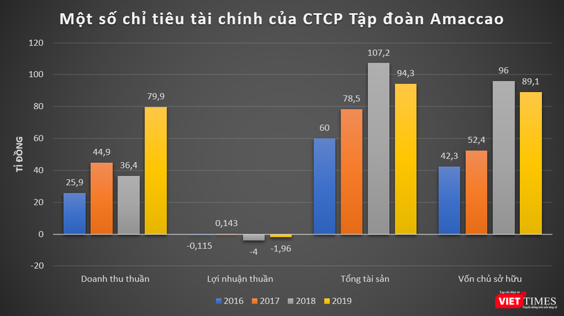 Dữ liệu của VietTimes cho thấy, trong 4 năm trở lại đây, Amaccao Group (công ty mẹ) chỉ báo lãi duy nhất một lần vào năm 2017 với mức lãi vỏn vẹn 143 triệu đồng. Gần nhất là năm 2019, Amaccao ghi nhận doanh thu thuần đạt 79,9 tỉ đồng, lỗ thuần ở mức 1,96 tỉ đồng, trong khi năm 2018 cũng lỗ 4 tỉ đồng.