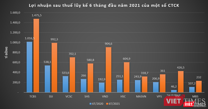 Thống kê của VietTimes cho thấy, một số công ty chứng khoán có lợi nhuận sau thuế lũy kế 6 tháng đầu năm 2021 tăng gấp nhiều lần so với nửa đầu năm 2020, như: CTCP Chứng khoán VnDirect (Mã CK: VND); CTCP Chứng khoán Bản Việt (VCSC - Mã CK: VCI); CTCP Chứng khoán Sài Gòn - Hà Nội (Mã CK: SHS); CTCP Chứng khoán Tp. HCM (HSC - Mã CK: HCM).