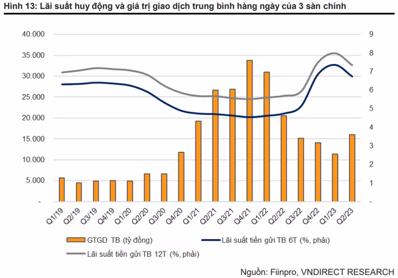 VNDirect cho biết, thanh khoản của thị trường chứng khoán cũng đã tăng lên kể từ tháng 4/2023, với giá trị giao dịch trung bình hàng ngày trên 3 sàn chính đạt xấp xỉ 16.000 tỉ đồng.