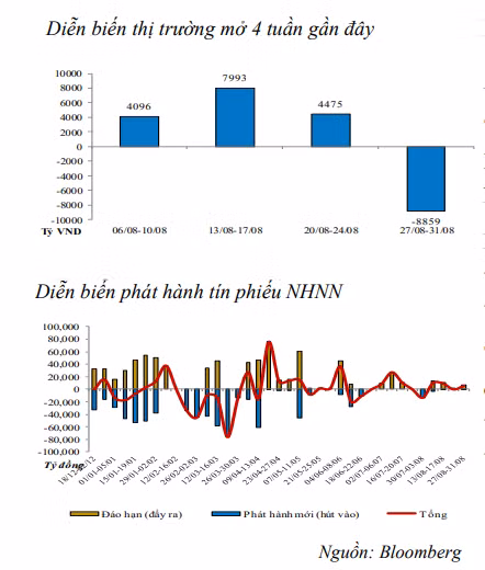 Trích dẫn số liệu từ Bloomberg, báo cáo phân tích của Công ty cổ phần chứng khoán Bảo Việt (BVSC) cho thấy, tuần từ 27/8 – 31/8/2018, NHNN đã thực hiện bơm mới 7.705 tỷ đồng qua kênh thị trường mở (OMO), trong khi đó lượng vốn đáo hạn qua kênh này đạt 16.564 tỷ đồng. Như vậy, NHNN đã hút ròng 8.859 tỷ đồng qua kênh này.