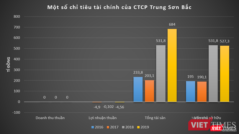Vài năm gần đây, Trung Bắc Sơn không ghi nhận doanh thu và liên tiếp báo lỗ. Năm 2017, 2018 và 2019, công ty này lần lượt báo lỗ thuần ở mức 4,9 tỉ đồng, 102 triệu đồng và 4,56 tỉ đồng.
