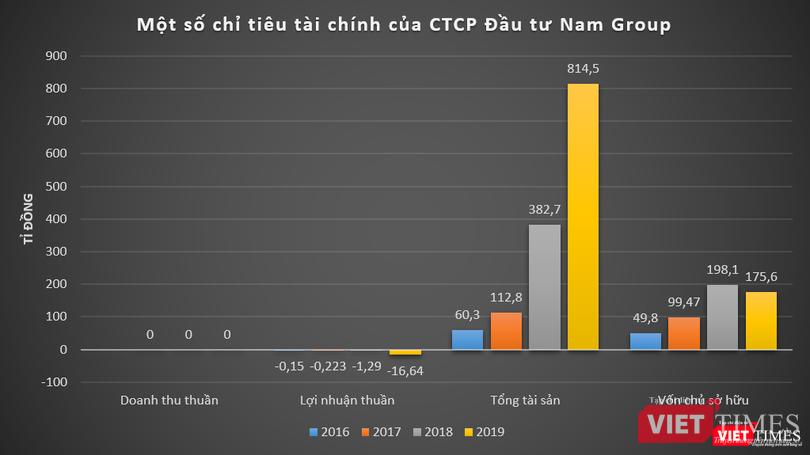 Dữ liệu của VietTimes cho thấy, trong giai đoạn 2016 - 2019, Nam Group (công ty mẹ) không ghi nhận doanh thu, liên tục báo lỗ. Gần nhất, năm 2019, công ty này báo lỗ thuần 16,64 tỉ đồng.