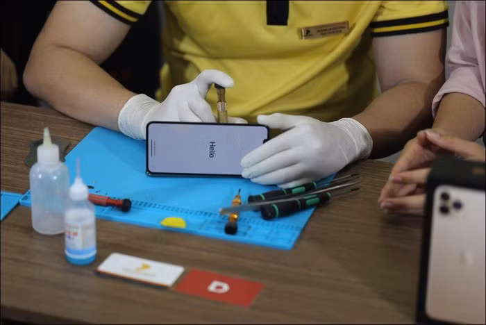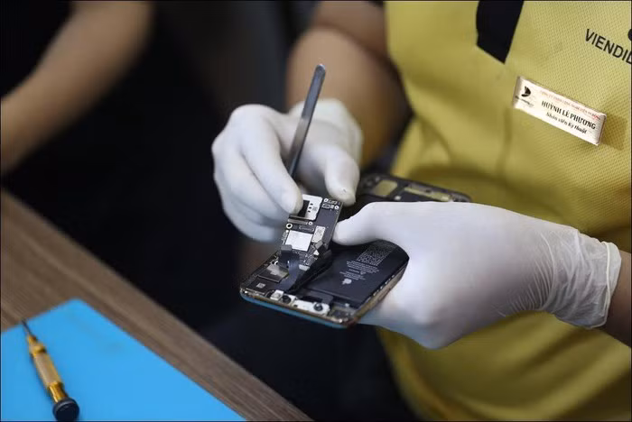Kỹ thuật viên tháo nắp lưng máy.