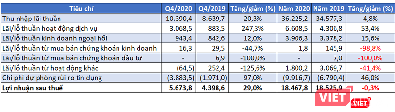 Thu nhập lãi thuần của nhà băng này bứt phá trong quý cuối của năm 2020, đạt mức 10.390 tỉ đồng, tăng 20,3% so với cùng kỳ, đóng góp gần 1/3 tổng thu nhập lãi thuần của cả năm. Dẫu vậy, luỹ kế cả năm 2020, nguồn thu này chỉ tăng trưởng vỏn vẹn 4,8%.