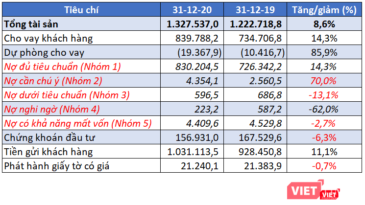 Tính đến ngày 31/12/2020, tổng tài sản của Vietcombank đạt 1,3 triệu tỉ đồng, tăng 8,6% so với đầu năm.