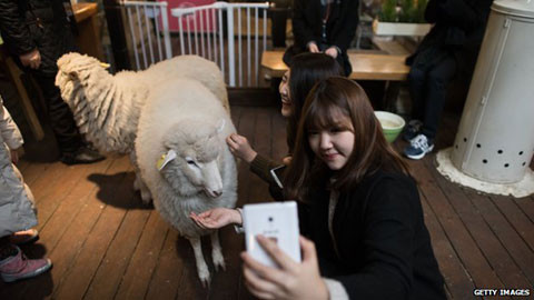 Thiếu nữ Hàn Quốc chụp ảnh với những chú cừu tại một quán cà phê ở thủ đô Seoul. Cũng như dê, cừu là biểu tượng của sự may mắn, tài lộc và những điều tốt đẹp. (Ảnh: Getty)