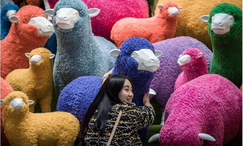 Một phụ nữ chụp ảnh cùng những chú cừu mô hình ở Hong Kong. Trong tiếng Trung Quốc, "dê" và "cừu" là hai từ đồng âm, vì thế năm Dê cũng được gọi là năm Cừu. (Ảnh: News)