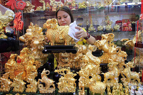 Một người bán hàng ở Minila, Philippines đang lau những bức tượng hình con dê mạ vàng óng ánh. (Ảnh: News)
