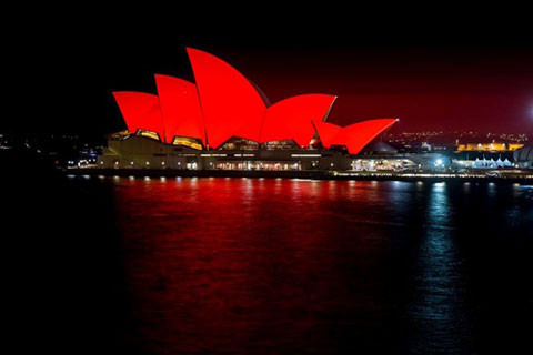 Nhà hát opera ở Sydney, Australia, chuyển tông đỏ để hưởng ứng không khí đón tết của người dân châu Á sống ở nơi đây. (Ảnh: PRNAsia)