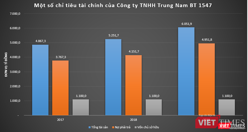 Theo dữ liệu của VietTimes, nguồn vốn nợ phải trả của doanh nghiệp dự án - Công ty TNHH Trung Nam BT 1547, liên tục gia tăng trong giai đoạn 2017 – 2019, cao gấp nhiều lần quy mô vốn chủ sở hữu. Tính đến cuối năm 2019, nguồn vốn nợ phải trả của Trung Nam BT 1547 đạt mức 4.951,8 tỉ đồng, cao gấp 4,5 lần so với quy mô vốn chủ sở hữu.
