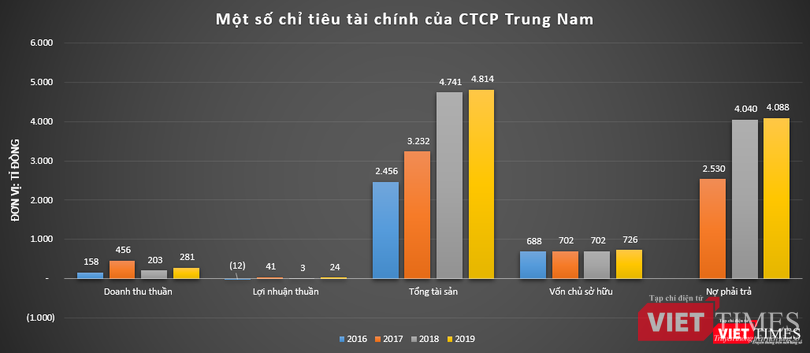 Từ cuối năm 2019, Trungnam Land tiếp tục duy trì đòn bẩy tài chính ở mức cao, khi nợ phải trả trên báo cáo riêng lẻ cao gấp 5,6 lần quy mô vốn chủ sở hữu, đạt mức 4.088,4 tỉ đồng.