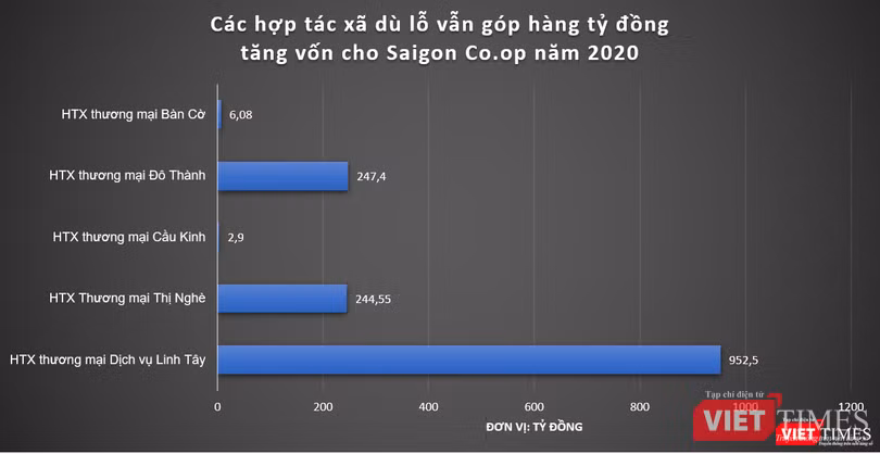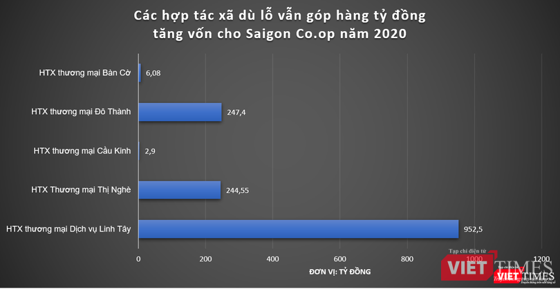 Cụ thể, các HTX này bao gồm: HTX thương mại Dịch vụ Linh Tây (lỗ 48,8 triệu đồng) góp 952,534 tỷ đồng; HTX Thương mại Thị Nghè (lỗ 163,6 triệu đồng) góp 244,55 tỷ đồng; HTX thương mại Cầu Kinh (lỗ 105,9 triệu đồng) góp 2,9 tỷ đồng; HTX thương mại Đô Thành (lỗ 721,4 triệu đồng) góp 247,4 tỷ đồng); HTX thương mại Bàn Cờ (lỗ 1,85 tỷ đồng) góp vốn 6,08 tỷ đồng.