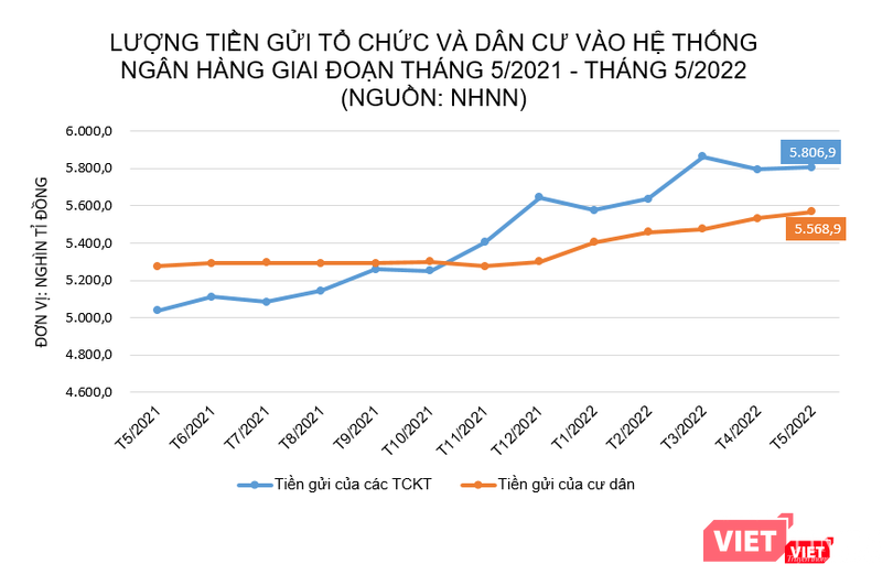 Tương tự, lượng tiền gửi của các tổ chức kinh tế (TCKT) cũng tăng nhẹ 11.589 tỉ đồng so với tháng 4/2022.