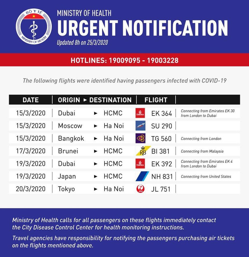 Bộ Y tế đề nghị các đại lý bán vé cho các hành khách trên có trách nhiệm thông báo cho hành khách đã mua vé bay trên các chuyến máy bay này.