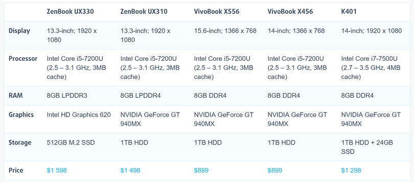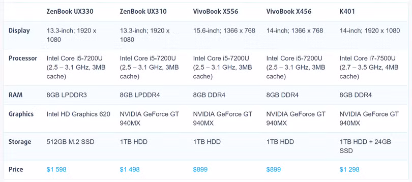 Đáng chú ý là bên cạnh những sản phẩm cấu hình khủng và mức giá tương đương với chiếc ZenBook 3vừa ra mắt gần đây, người dùng còn có cả những lựa chọn có mức giá phải chăng hơn. Cụ thể, qua bảng thông số cấu hình và giá bán bên dưới, có thể nhận thấy VivoBook X556 và VivoBook X456 là 2 sản phẩm có giá bán khá dễ chịu, chỉ 899 USD trong khi vẫn trang bị bộ xử lý Intel Core i5-7200U (Kaby Lake), RAM DDR4 dung lượng 8GB, đồ họa rời GeForce GT 940M và 1TB ổ cứng.