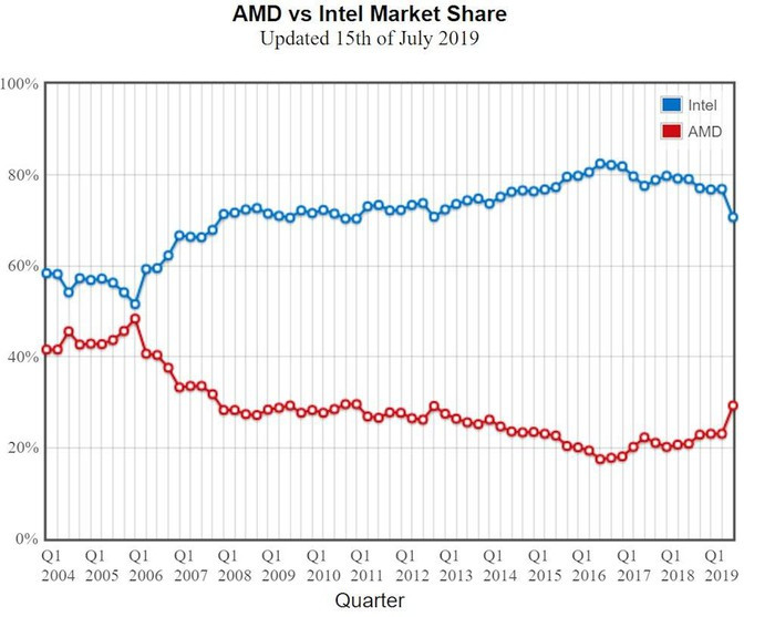 Theo báo cáo thị phần của PassMark, thị phần CPU của Intel đã sụt giảm từ 76,90% xuống 70,70% trong khi thị phần CPU của AMD tăng từ 23,10% lên 29,30% trong khoảng thời gian từ quý 1 2018 cho đến quý 1 2019. AMD có một lộ trình phát triển mạnh với các sản phầm Zen core trong tương lai và nhiều mặt hàng khác cho desktop, notebook, server và HEDT (high-end desktop). Trong tương lai, AMD sẽ cạnh tranh mạnh mẽ hơn với một "ông lớn" Intel đã có dấu hiệu yếu thế dần trên thị trường.