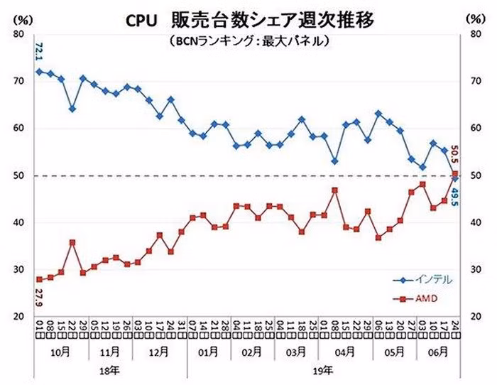 Theo một nguồn tin khác từ phía BNC Ranking, công ty chuyên thu thập số liệu từ các nhà bán lẻ lớn tại thị trường Nhật Bản, thị phần của CPU AMD Ryzen đã vượt qua thị phần của Intel. Họ đang chiếm 50,5% thị phần so với 49,5% của Intel. Xu thế này tiếp diễn khi thị phần của Intel đã cho thấy dấu hiệu sụt giảm mạnh so với số liệu 72,1% hồi tháng 10 năm 2018.