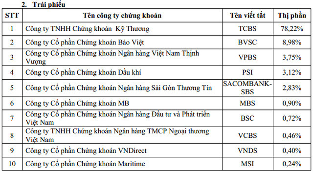 Về thị phần môi giới trái phiếu năm 2016, không bất ngờ khi TCBS giữ vững vị trí số 1 với thị phần áp đảo 78,22%, bỏ xa đối thủ đứng thứ 2 là BVSC với thị phần 8,98%. Kế đến là VPBS (3,75%), PSI (3,12%), Sacombank – SBS (2,83%).